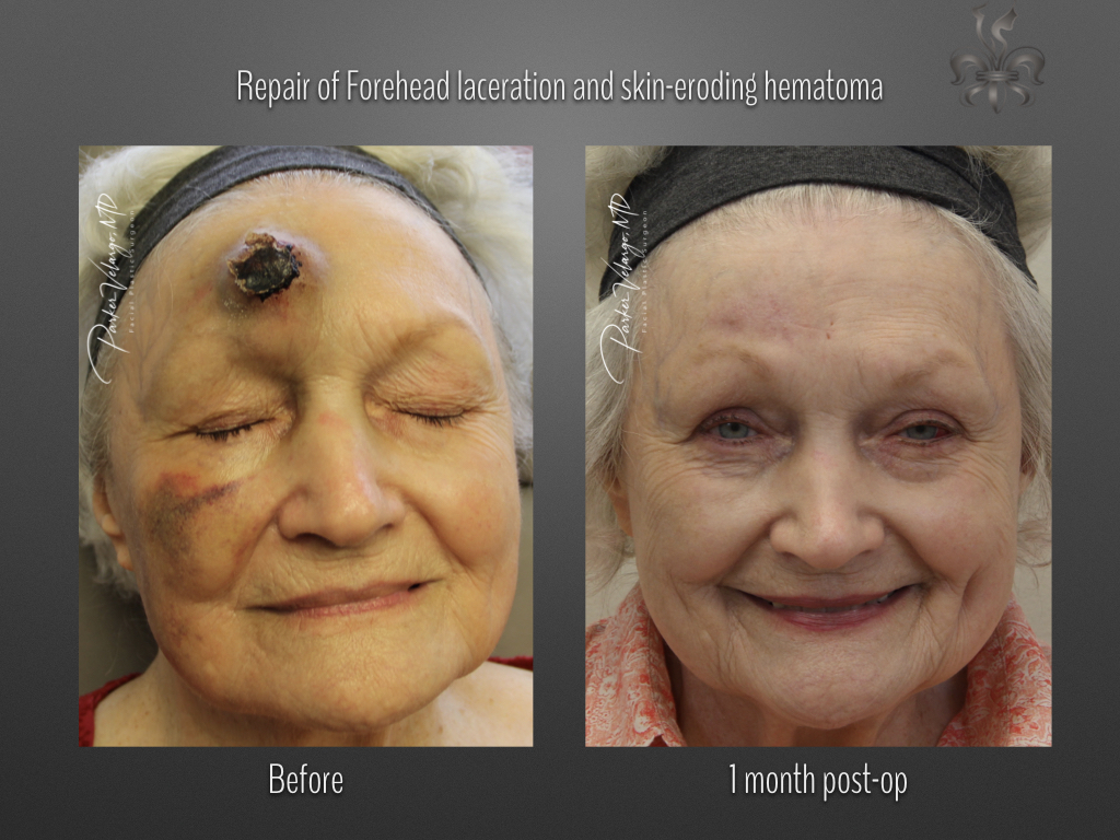This patient is 1 month after repair after forehead laceration and skin-eroding hematoma.